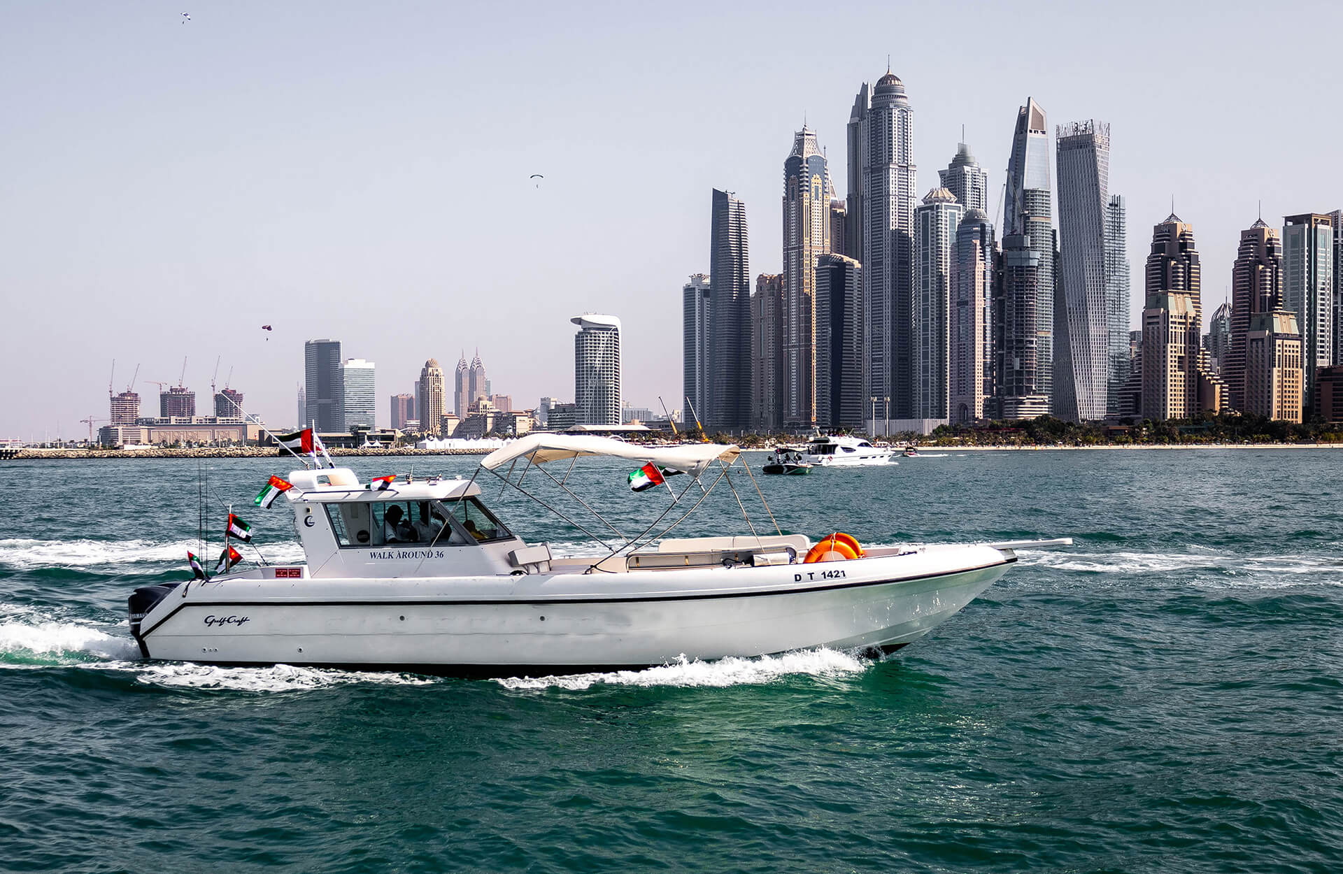 Rent the "Cruise Master 36ft" boat in Dubai, ideal for fishing trips or a day on the water with smaller groups. This day boat offers a compact yet comfortable experience, perfect for enjoying Dubai's waters without the need for a large yacht. Equipped with top-tier amenities, it’s perfect for those seeking an intimate, relaxing cruise or a fun fishing adventure. Book through Dubai Yacht Rental today for a memorable experience on the "Cruise Master 36ft" yacht.