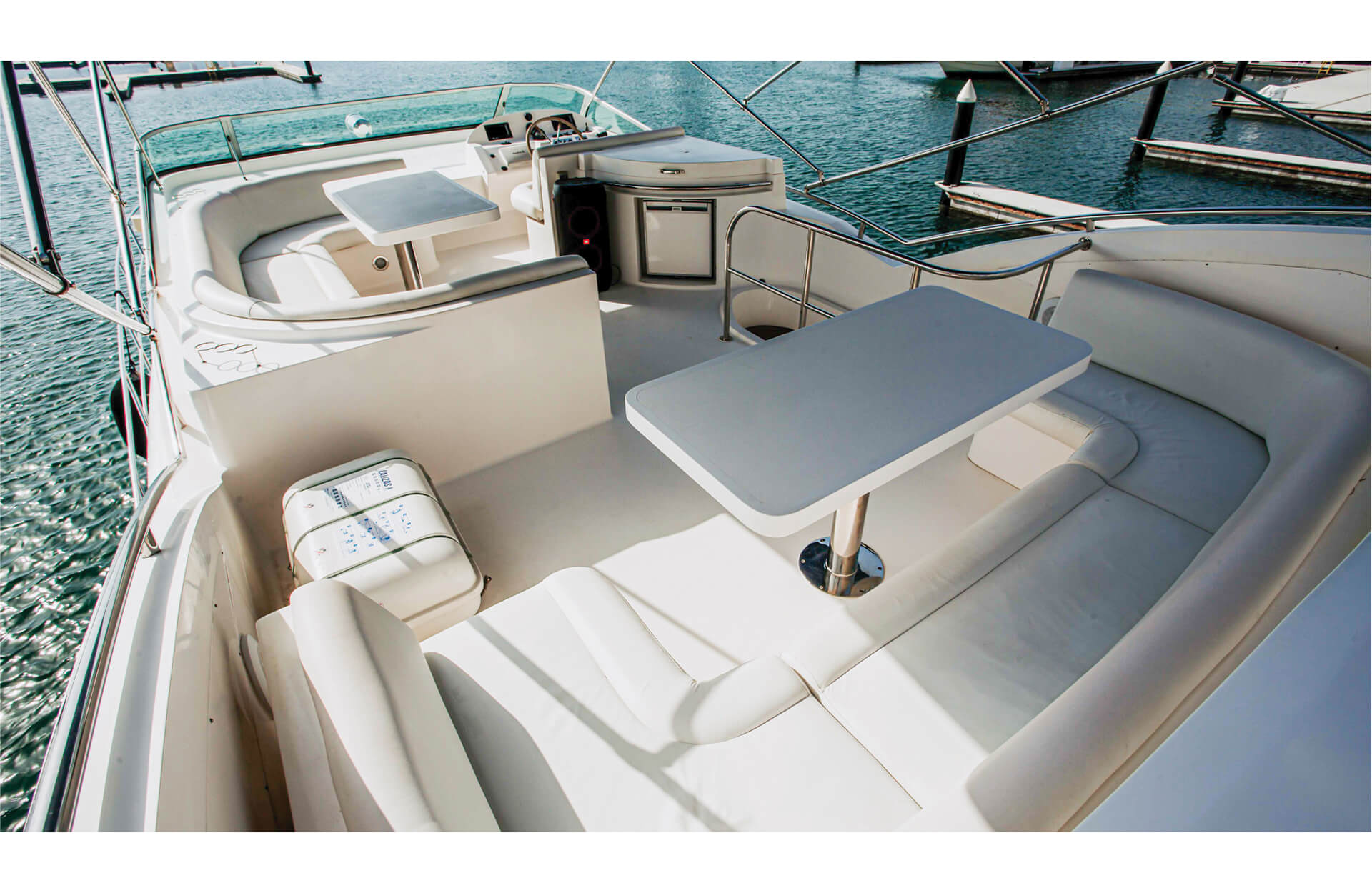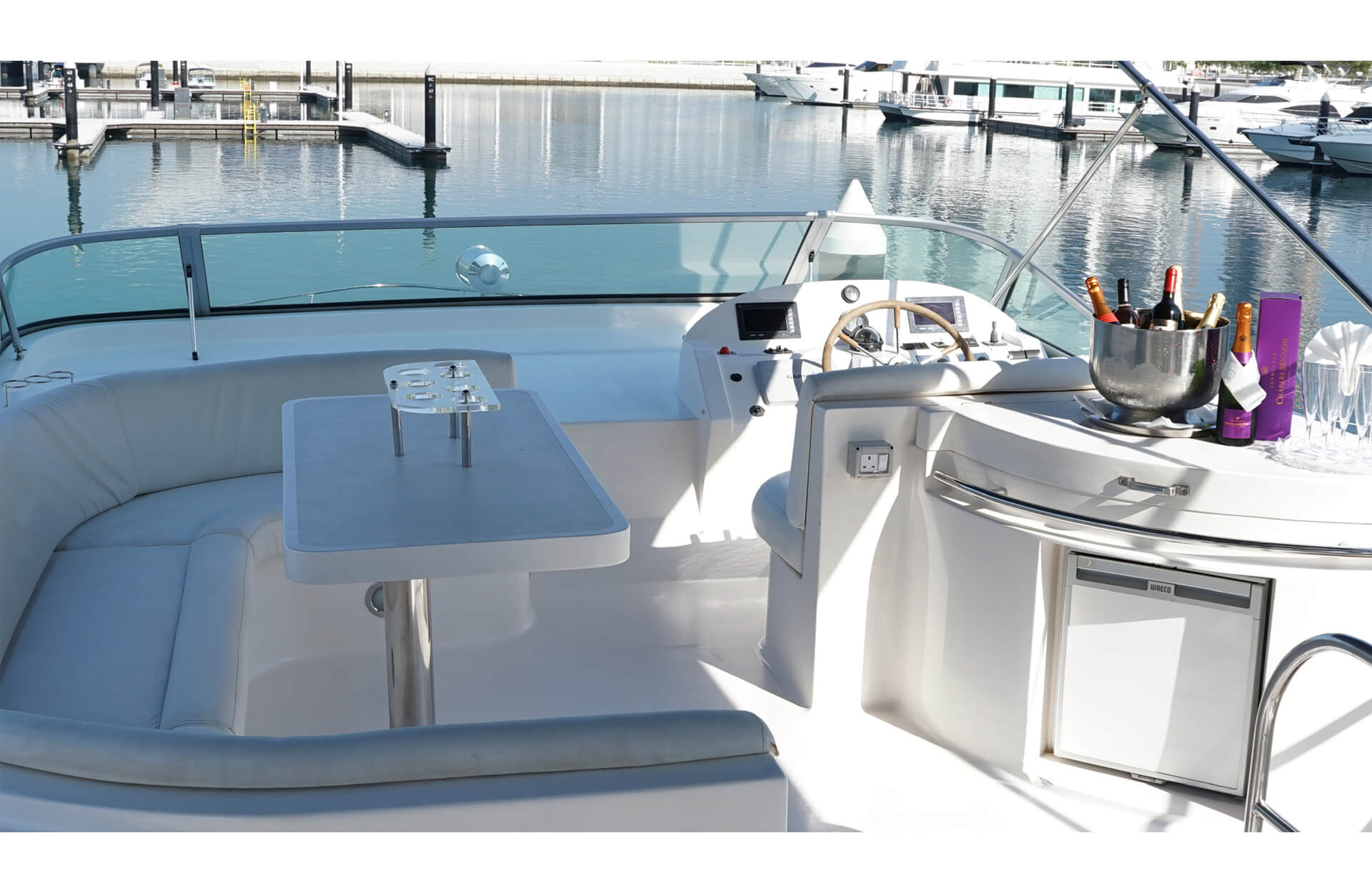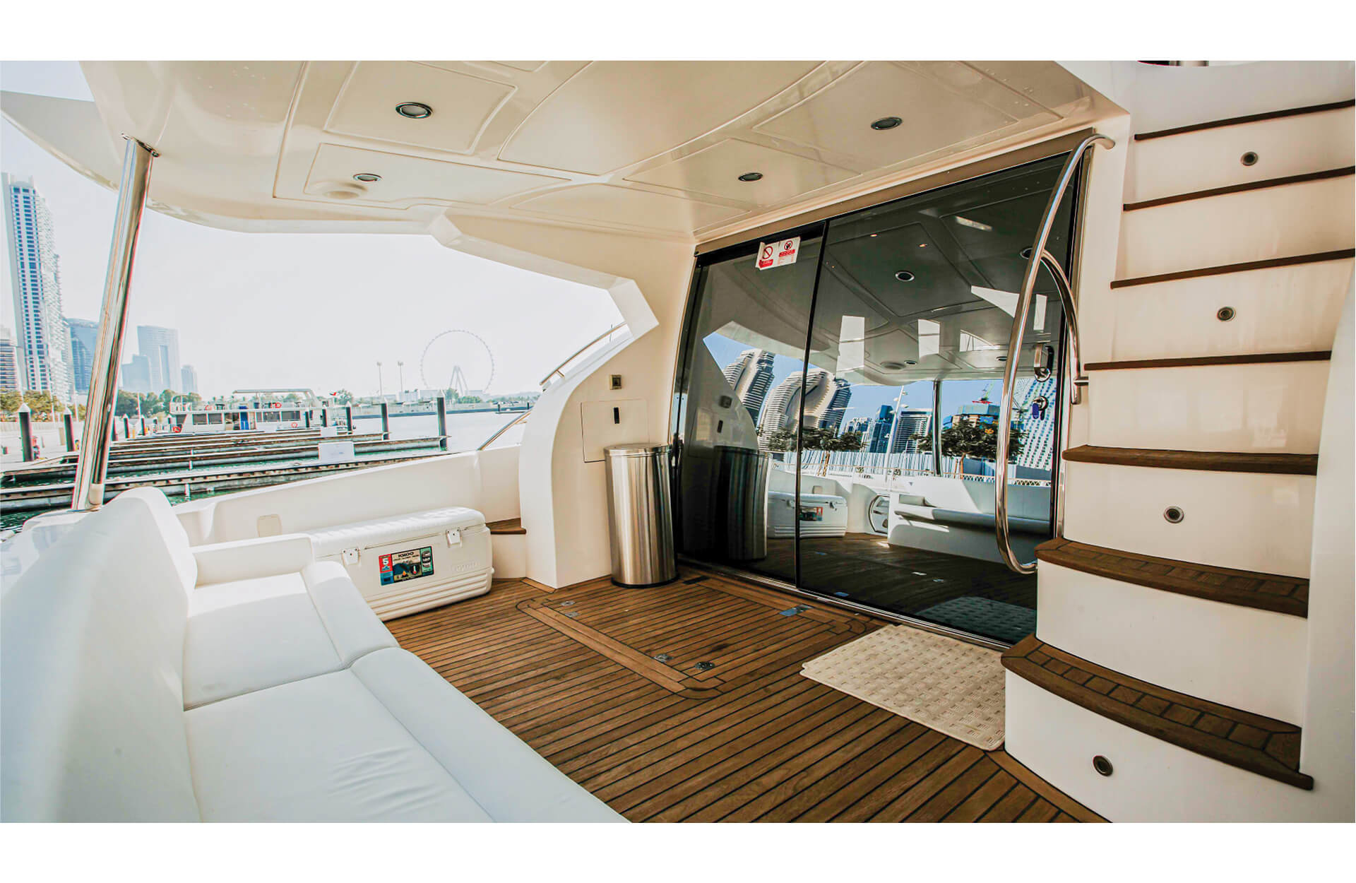 Rent the stunning "Lagoona" yacht in Dubai, a spacious 56-ft vessel built by Majesty that comfortably accommodates up to 24 guests. With two decks, stylish interiors, a social saloon, and sun-lounging areas, it’s perfect for lively celebrations or chilled day-time cruises. Departing from Dubai Harbour, this yacht offers the perfect backdrop of the coastline and skyline. Book through Dubai Yacht Rental today and enjoy a memorable experience aboard the "Lagoona" yacht.