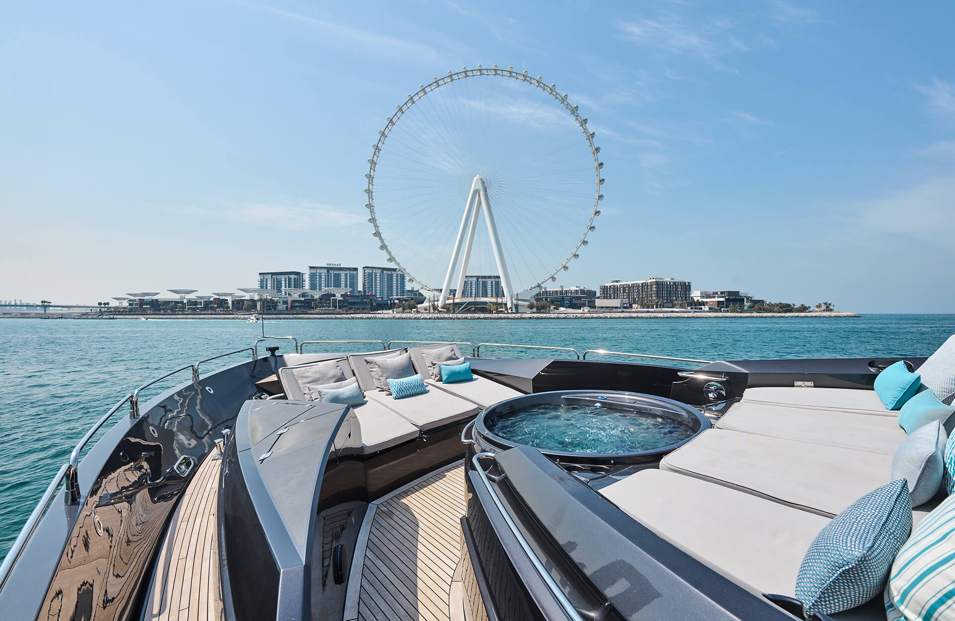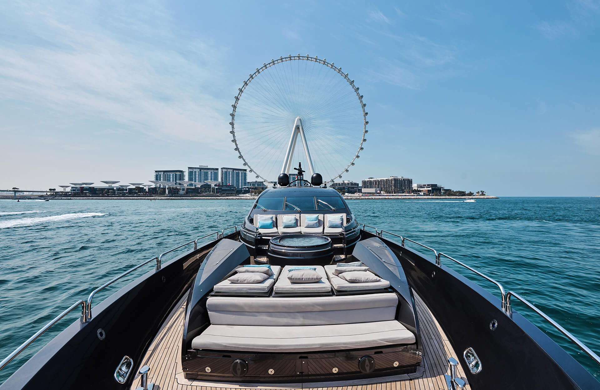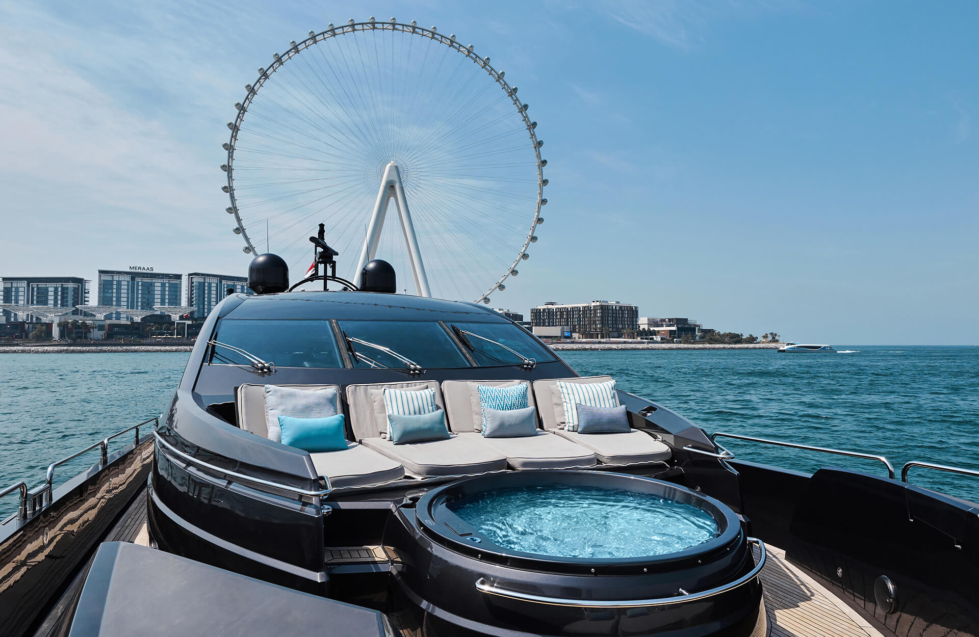Rent the striking "Eye" yacht in Dubai, featuring a sleek black design and a luxurious jacuzzi for ultimate relaxation. This yacht combines modern elegance with premium amenities, offering a perfect setting for private events or leisurely cruises. Soak in the jacuzzi while enjoying the stunning views of Dubai. Book your Dubai yacht for rent today and experience luxury on the water with the Eye yacht.