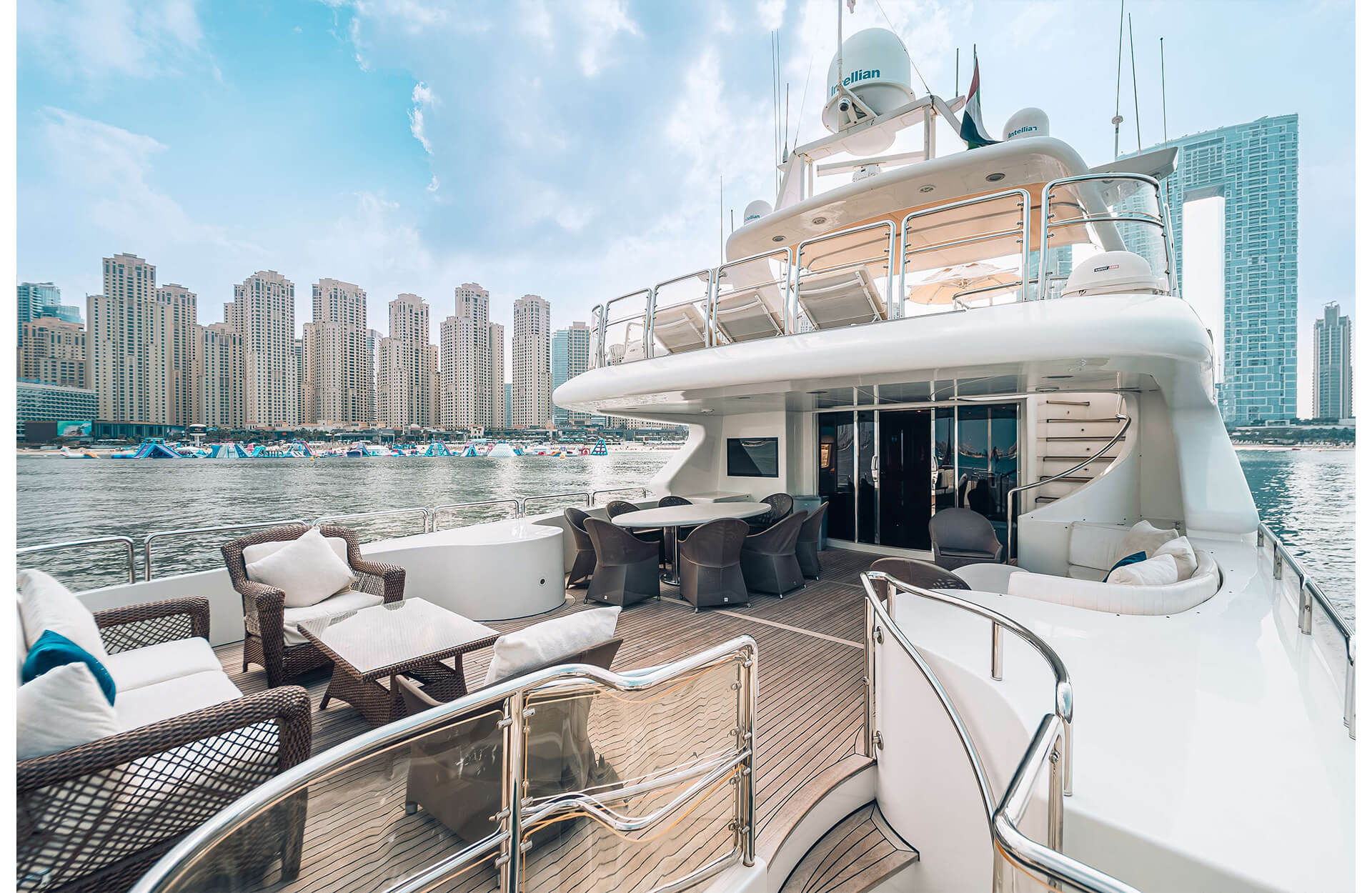 Rent the legendary "Gallus" yacht in Dubai, a luxury 115-ft motor yacht built by Benetti, ideal for a high-end charter. With a spacious Sun-deck layout, and a flybridge plus a Jacuzzi - it’s perfect for both intimate get-togethers and larger parties (day-cruise capacity up to 55 guests). Whether you want a relaxed cruise or a grand event, "Gallus" delivers comfort, style, and flexibility along Dubai’s stunning coastline. Book through Dubai Yacht Rental today and experience elite yachting aboard the "Gallus" yacht.