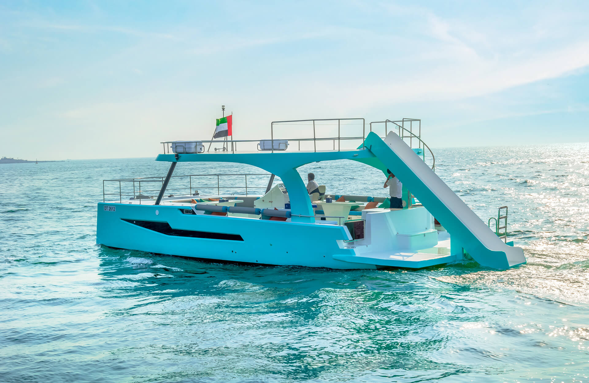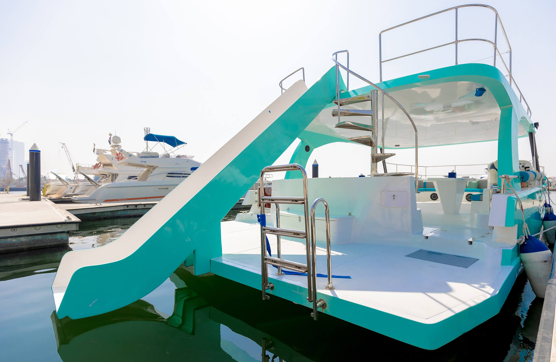 Charter Jump, a premium 56‑ft party yacht in Dubai, ideal for up to 12 guests. Featuring a built‑in slide, ample deck space, and room to mingle, it’s designed for fun, celebrations, or private cruising. Experience an exhilarating, intimate Dubai yacht rental with style and excitement.